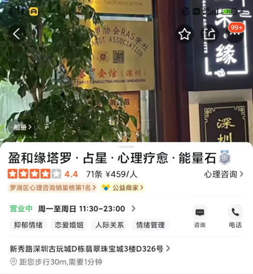 盈和缘塔罗会馆作为亚洲塔罗协会授权认证的专业机构,在塔罗服务领域独具特色。其严格遵循塔罗咨询职业标准,提供高品质的塔罗牌咨询服务,积极投身于塔罗文化的传播与创新发展事业之中。在大众点评有着很好的口碑,现已是深圳市罗湖区心理咨询店铺位居第一名。