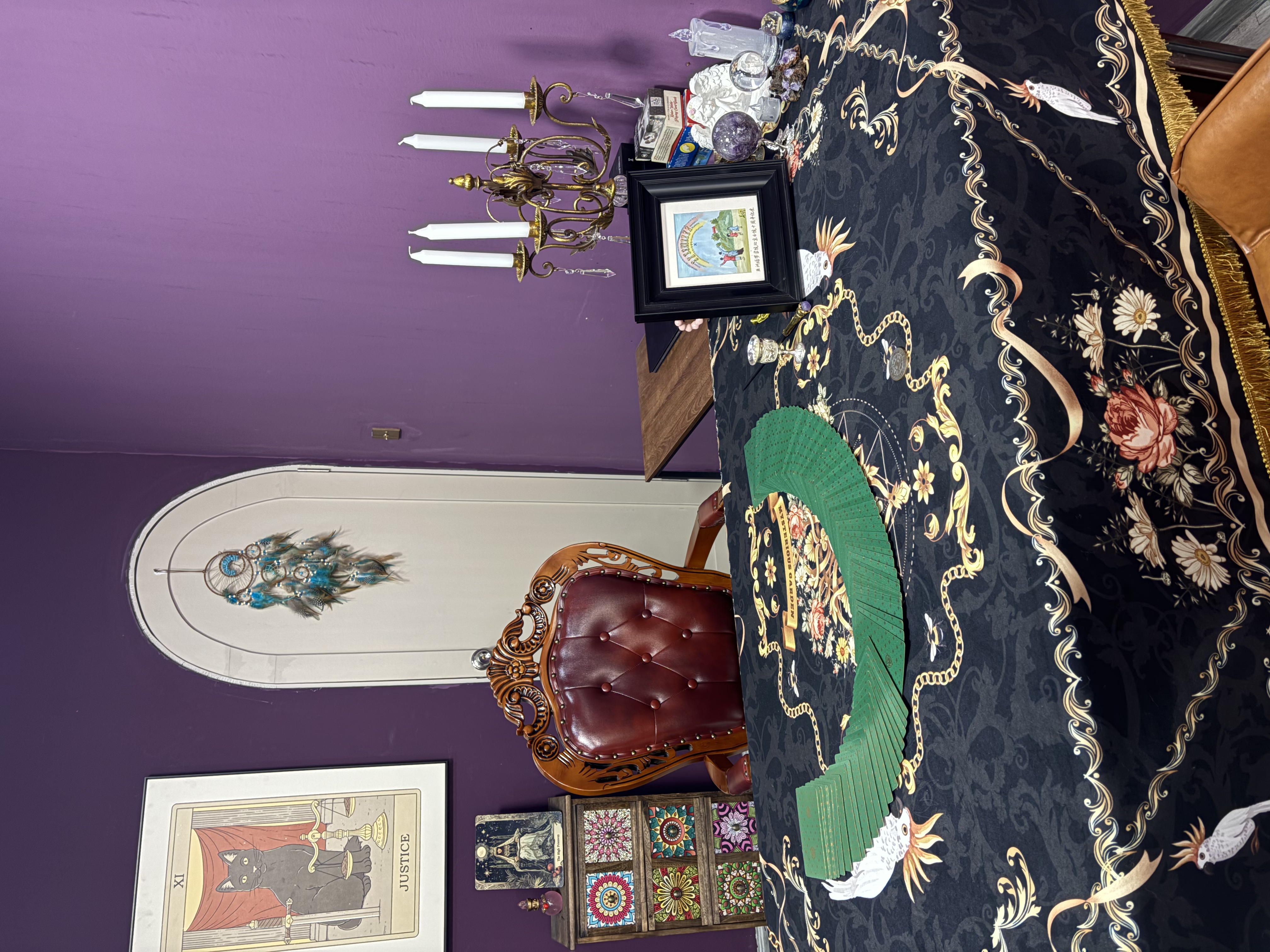 “寻光心灵社”塔罗馆,馆内以象征灵性、直觉与内在智慧的紫色为主色调,与塔罗探索心灵、指引方向的核心理念高度契合,旨在为来访者营造一个隔绝外界喧嚣、沉淀内心的静谧灵性空间,助力其开启与自我的深度对话。